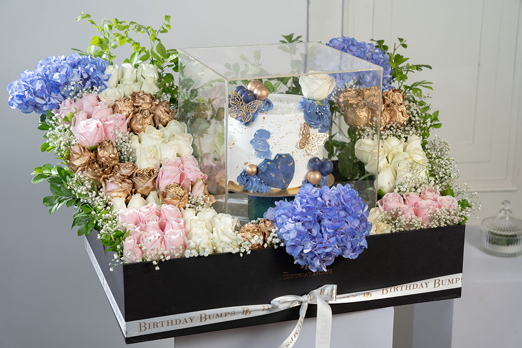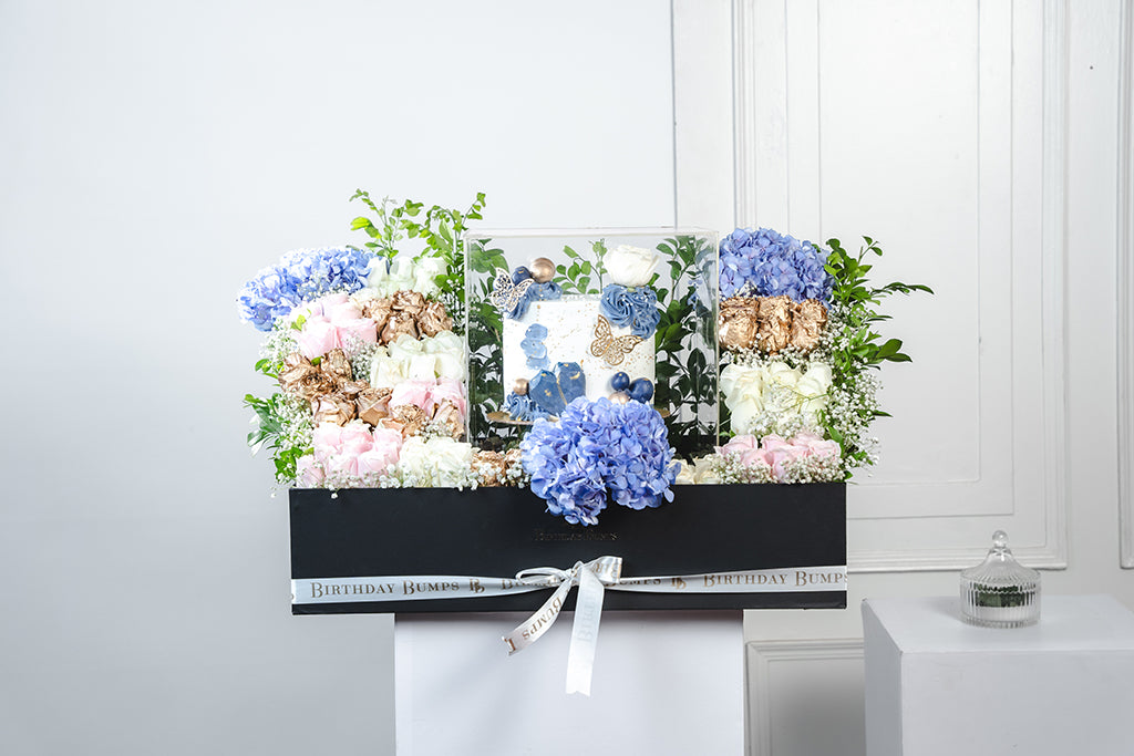 A luxurious medley of roses, Hydrangea and Greens paired with Delicious Blueberry White Chocolate acrylic box, making for a perfect gift.