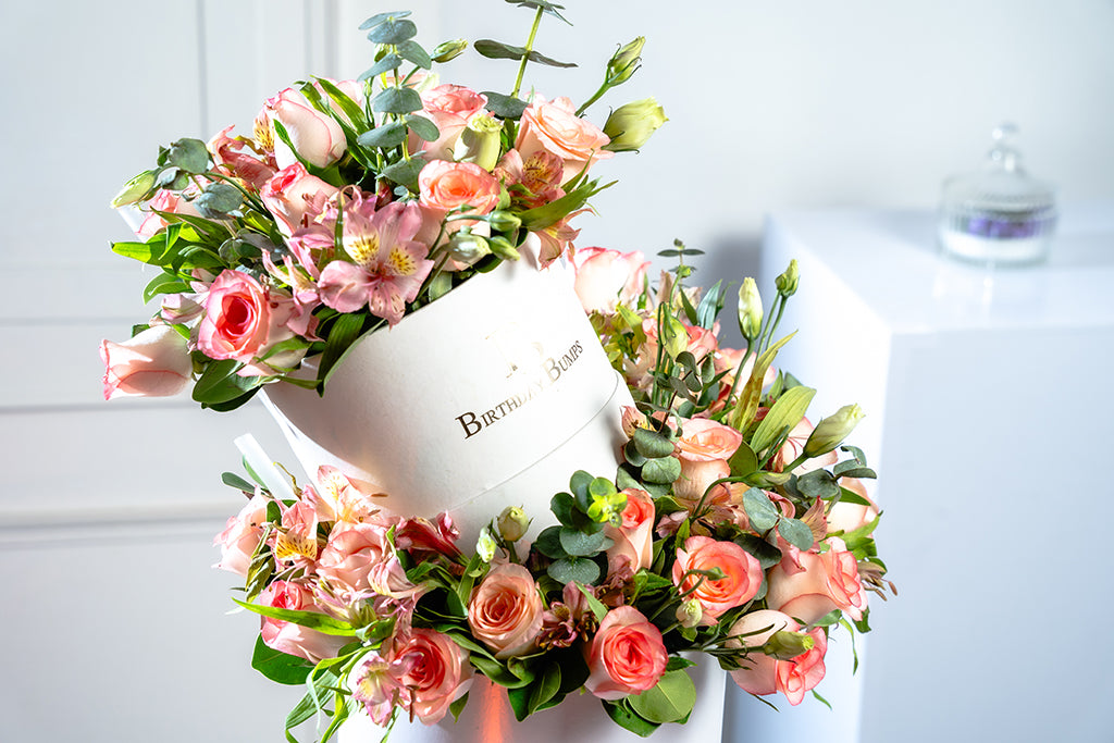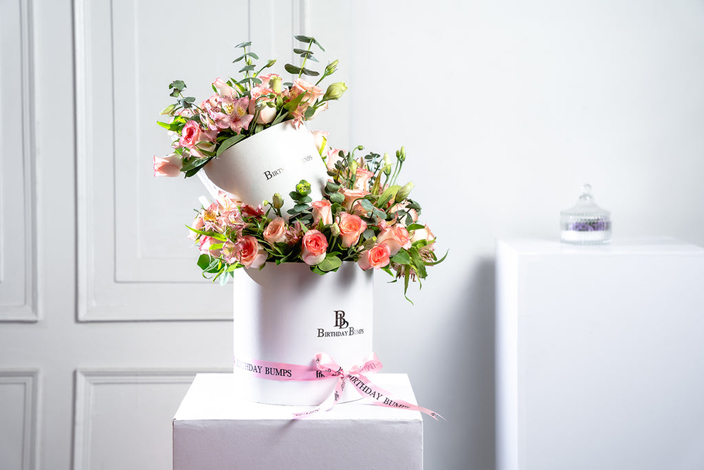 Celebrate your cherished one, expressing gratitude for fulfilling your heart’s desires. Delight in the elegance of pink roses, Pink Alstroemerias, Green Fillers in a double decker exotic box. Complete with a flower topper , it infuses a blush of floral bloom.