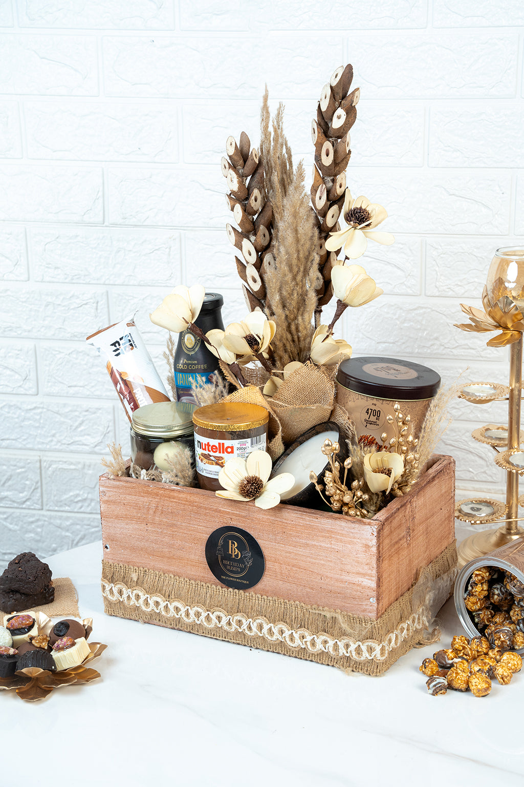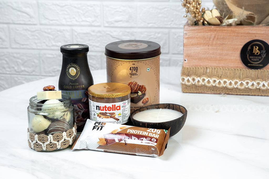 Luminous Dazzle glows with Diwali's divine Light. This Bohemian Hamper includes Scented Coconut Candle, Caramel Popcorn, Assorted Chocolates Jar, Coffee, Nutella Jar, Protein Bar with some Dry Flowers- it celebrates the season's blessings.