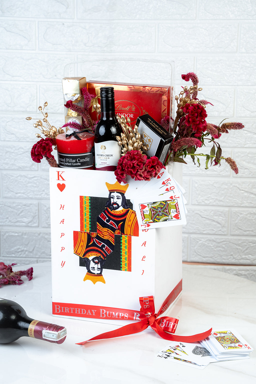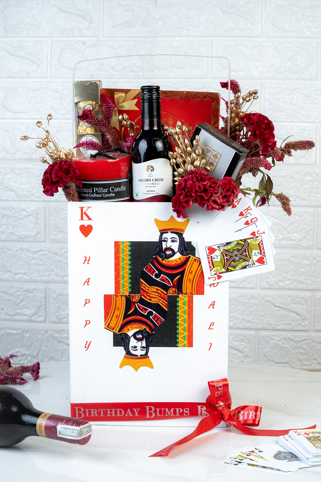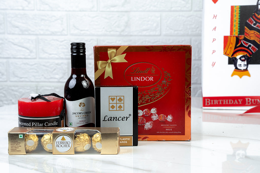 Luminous Dazzle glows with Diwali's divine Light. This Teen Patti Hamper includes Scented Candle, Playing Cards, Lindor Chocolates Pack, Ferrero Rochers , Non Alcoholic Wine with Some Red And Gold Flowers- it celebrates the season's blessings.