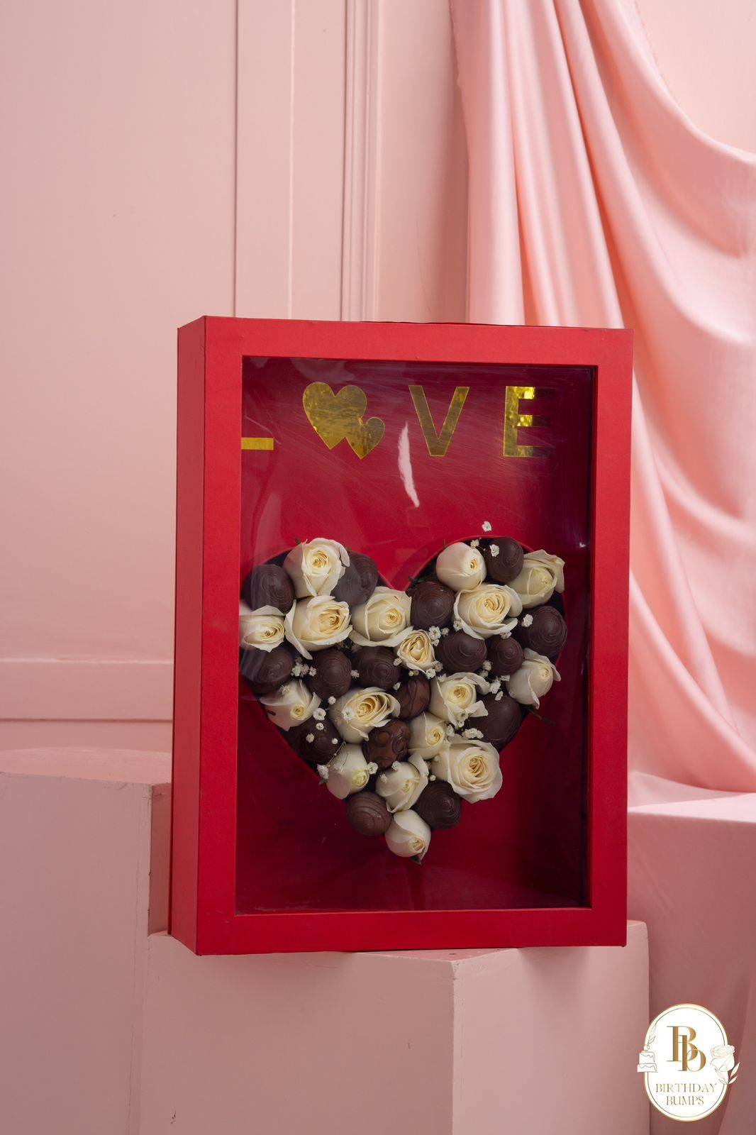 Show your love with a unique and romantic Valentine's Day gift! Our 'Love' chocolate and rose heart frame is filled with delicious chocolates and beautiful white roses, making it a decadent and unforgettable present. This handcrafted frame is perfect for surprising your sweetheart and creating a lasting memory.