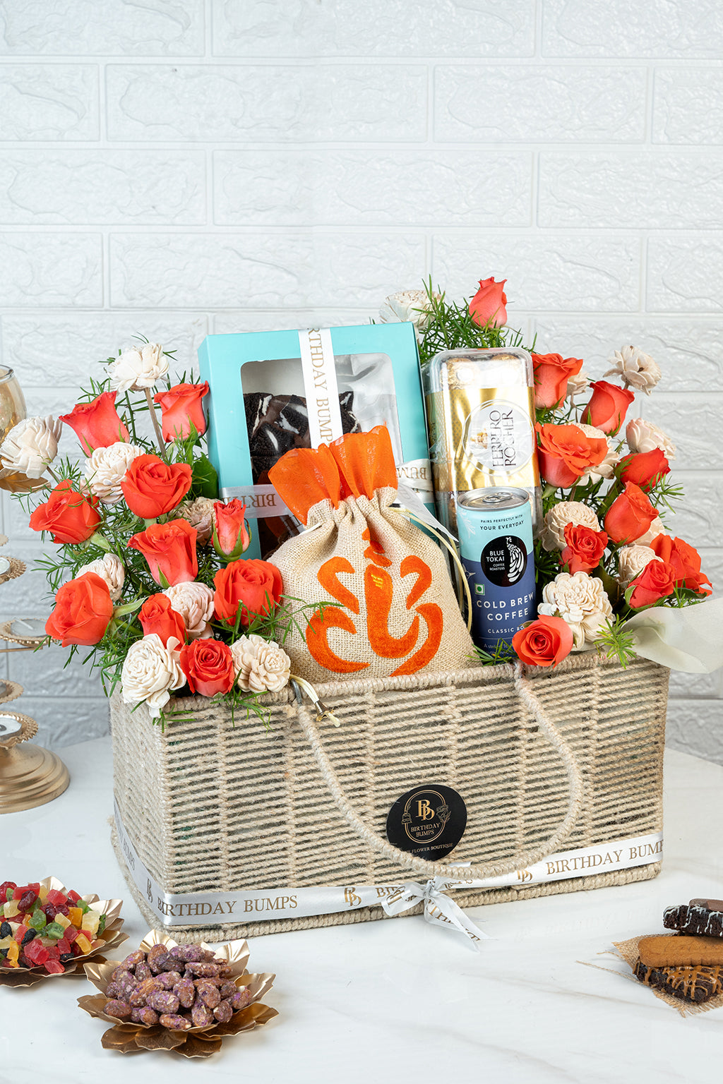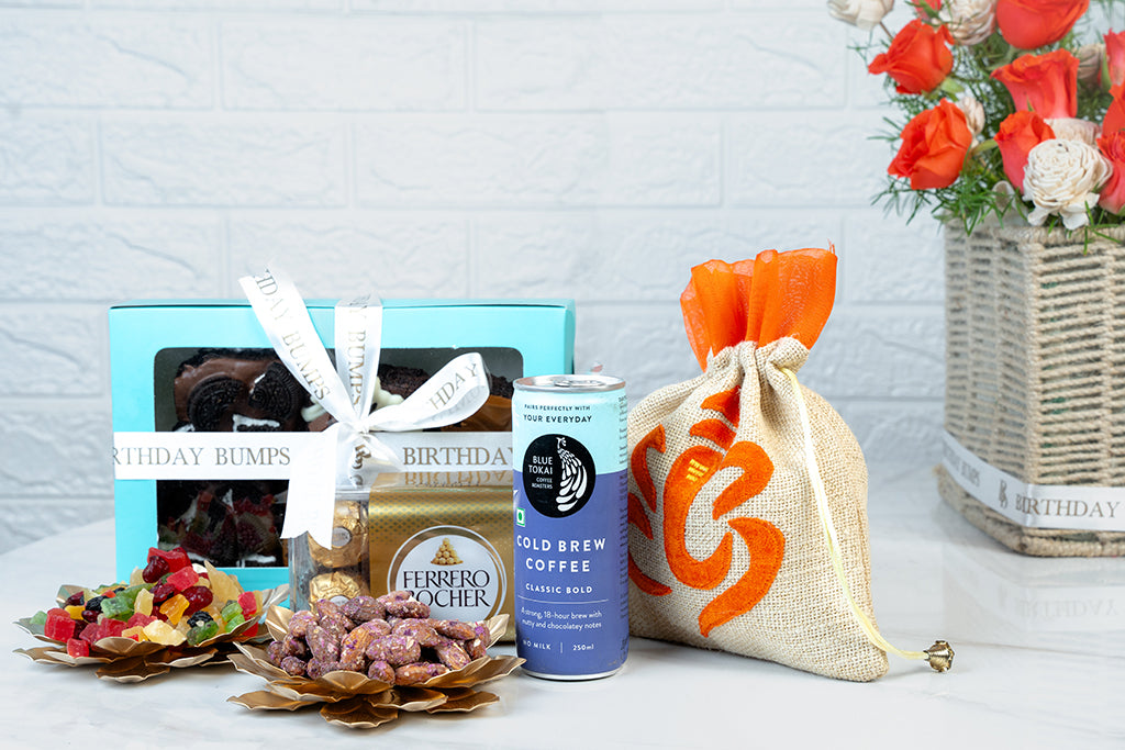 -Ferrero Rocher, Almonds Polti, Mix Dried Fruit Polti, Cold Brew Coffee, Assorted Fudge Brownie Box with Some Radiant Orange And Dry Flowers.