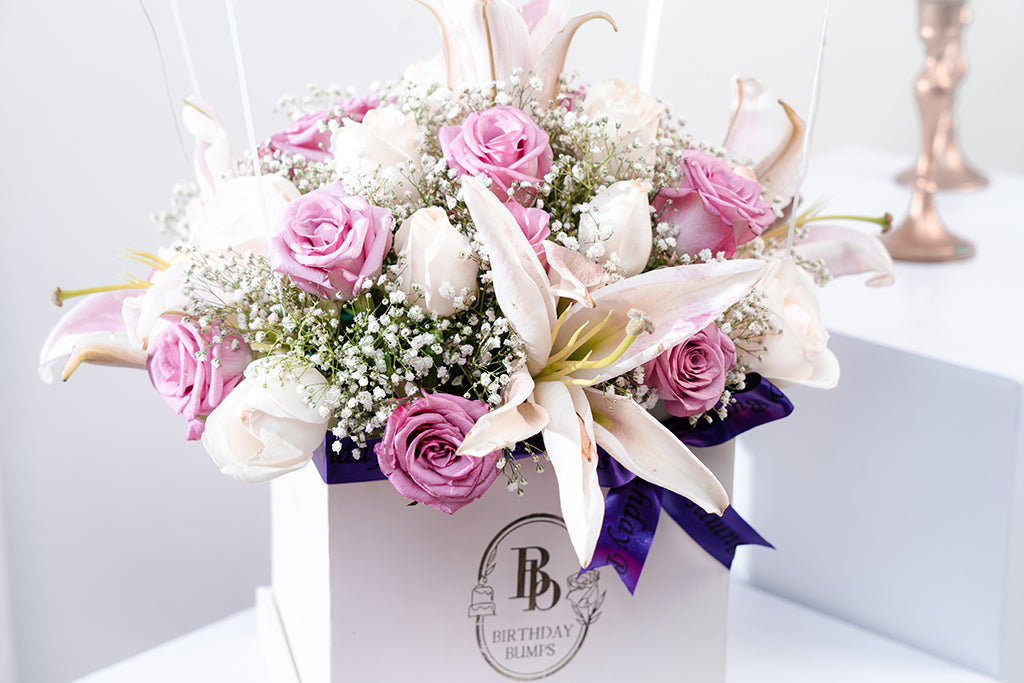 An Emblem of charm and tenderness, this magnificent arrangement is sure to add a dreamy touch to the celebrations and express your unparalled love with lilac roses, white lily & Gypsophilas.