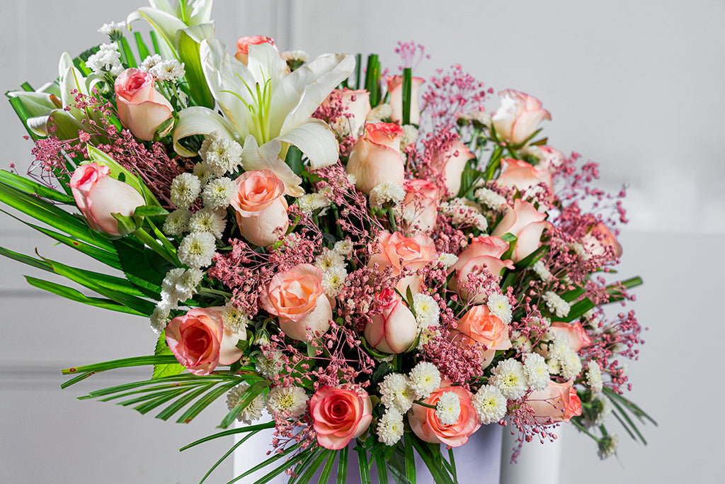 A Stunning Fusion of Roses, Lilies , Baby’s Breath & Daisies weaved together in our cube box to infuse delight all around.