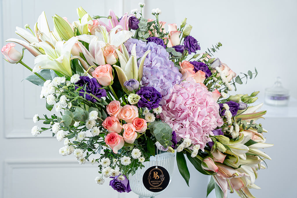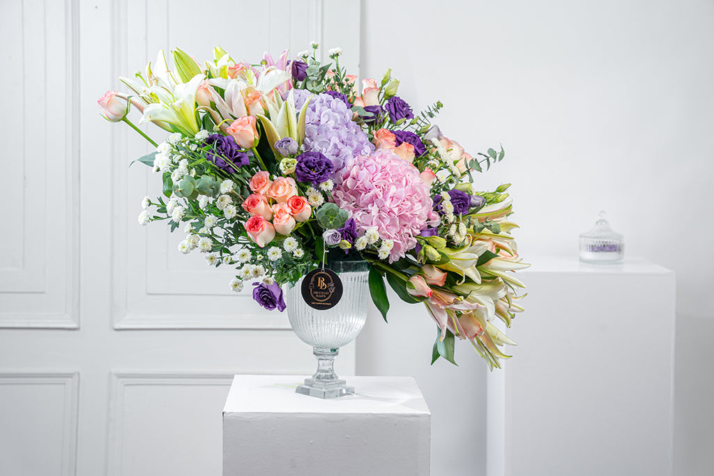 A Lavish array of fresh hydrangeas, delicate Lilies, Vibrant Roses ,Greens & eucalyptus and elegant blooms come together in a stunning floral masterpiece, Creating a feast for the senses and a visual delight for any occasion.