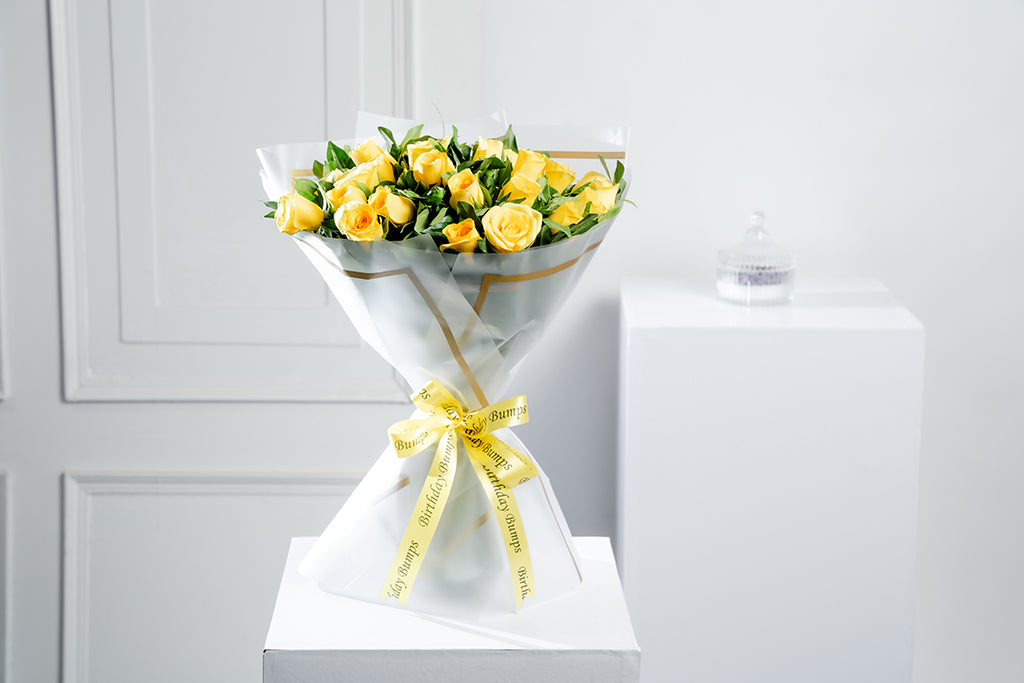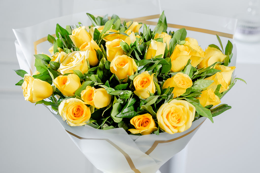 Let it rain floral stunners that mirror modesty and purity. The extraordinary assemblage coalesces yellow roses with some greens in a transparent wrap, to offer a peek into the beautiful world of floristry. Fill your space with captivating blooms that brighten up every home corner.