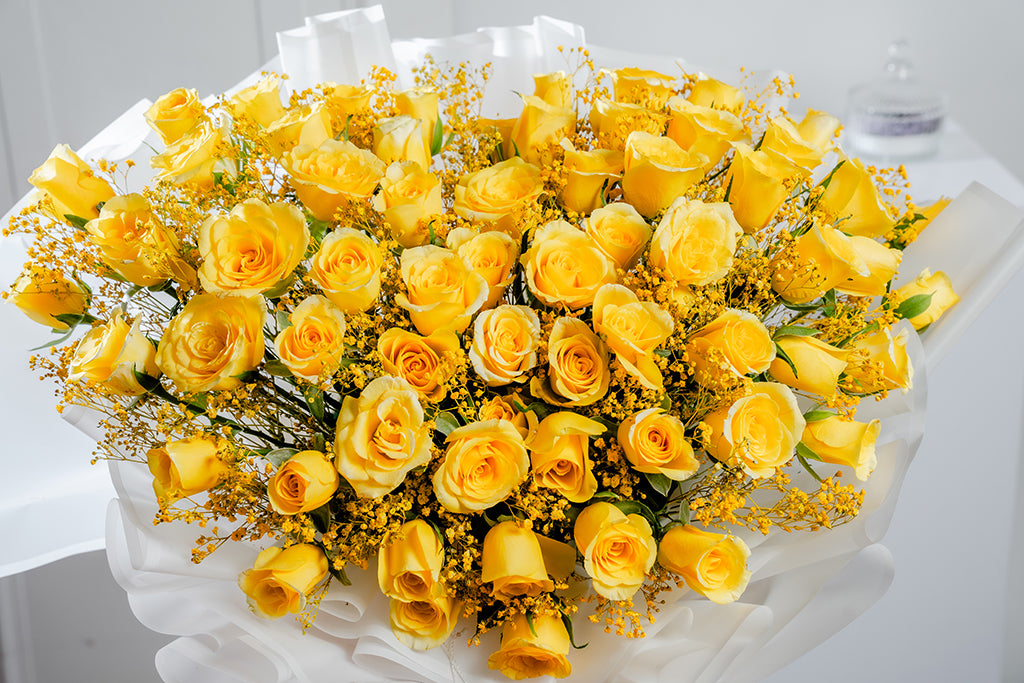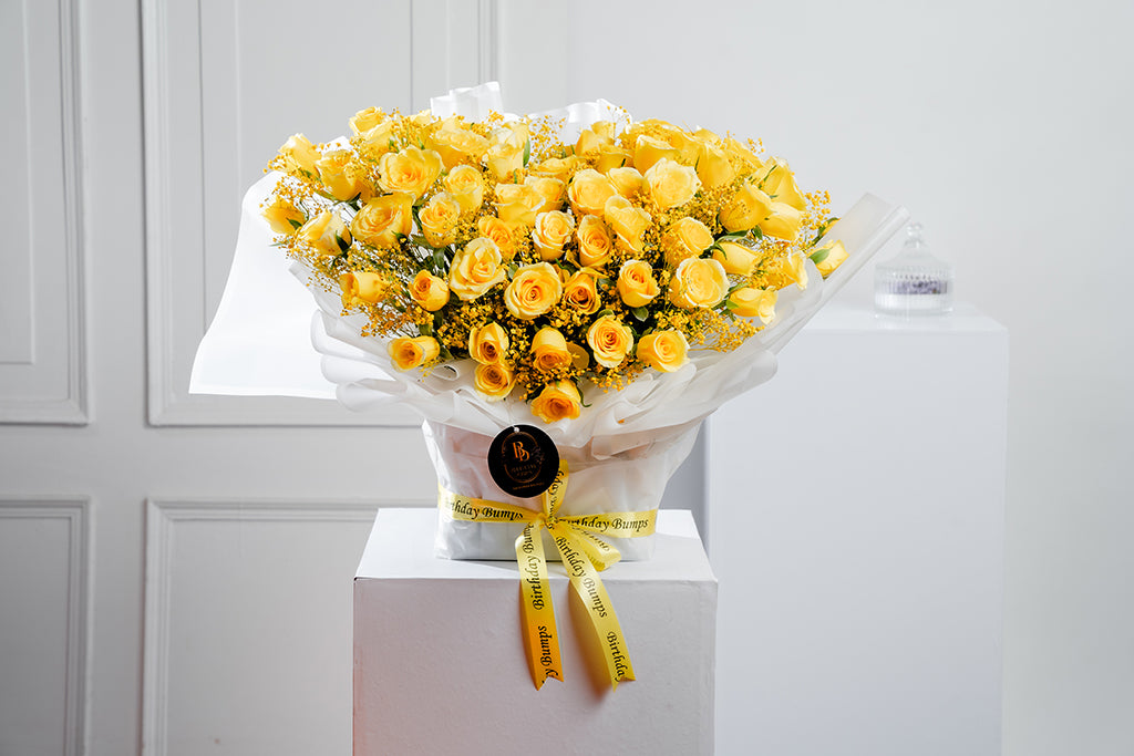 Let it rain floral stunners that mirror modesty and purity. The extraordinary assemblage coalesces yellow roses with some Baby’s Breath in a transparent wrap, to offer a peek into the beautiful world of floristry. Fill your space with captivating blooms that brighten up every home corner.
