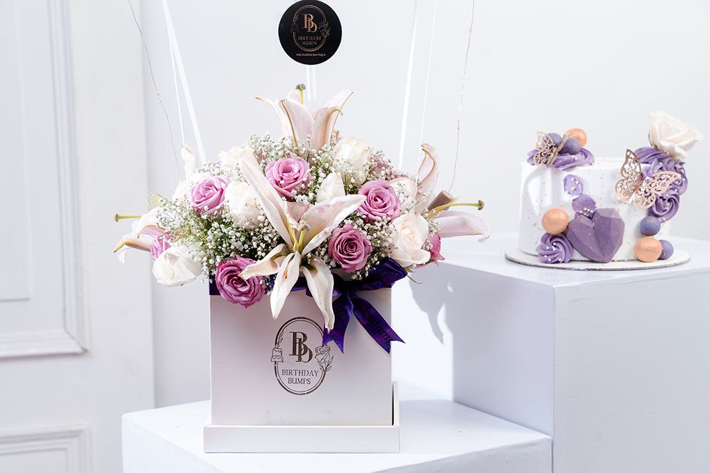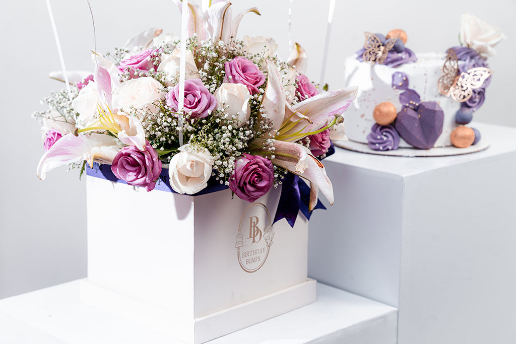 Indulge in the occasions with a decadent 1kg Blueberry White Chocolate Cake (Eggless) with a Floral customised Balloon Hamper. Handpicked and arranged with care to ensure long-lasting beauty.